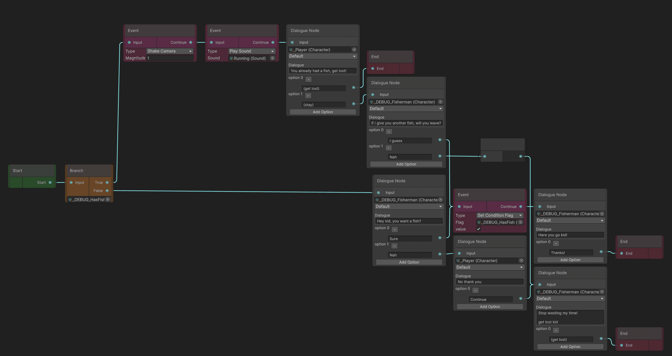Avoid code like dialogue writing with yarnspinner, instead use a dialogue graph that is clear and simple.